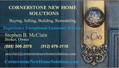 Call us today at 512-876-3116 or email SMcClain@CornerstoneNewHomeSolutions.com.